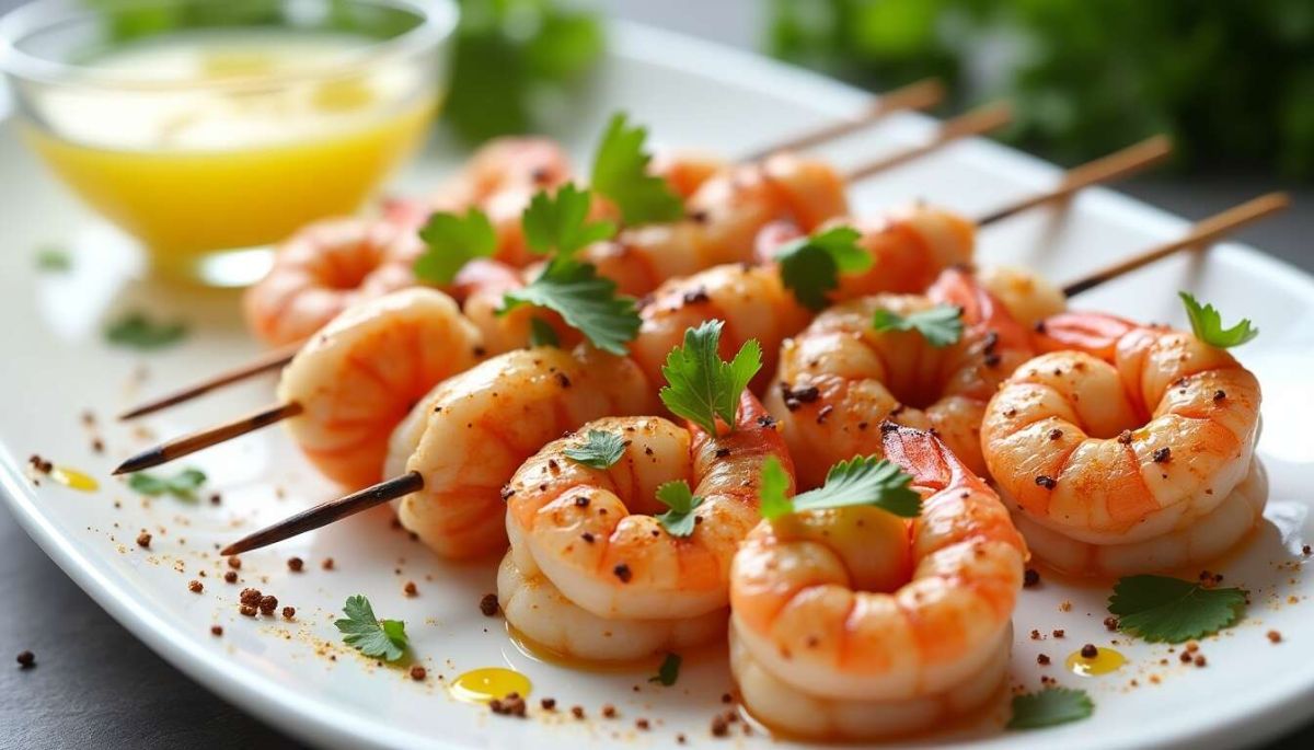 Les brochettes de crevettes marinées à l'ail et à la coriandre sont une véritable invitation au voyage. Faciles à réaliser, elles enchanteront vos papilles par leurs saveurs fraîches et intenses, parfaites pour un repas convivial en famille ou entre amis.