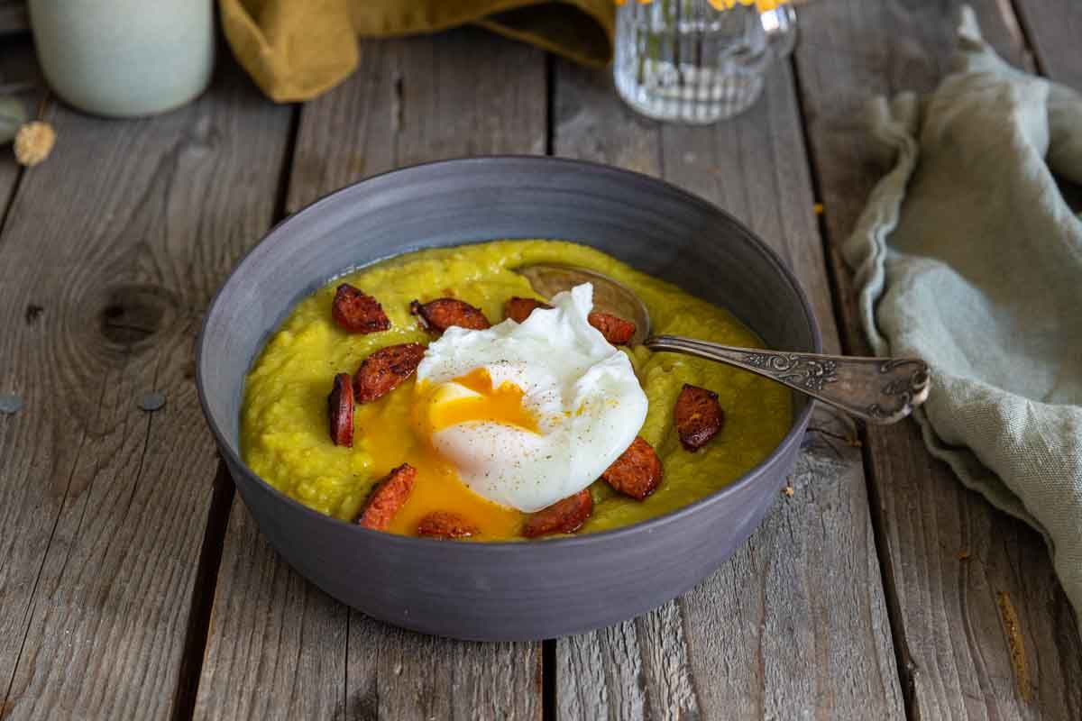 - Servez la soupe bien chaude, garnie de chips de chorizo et d’un œuf poché par portion.