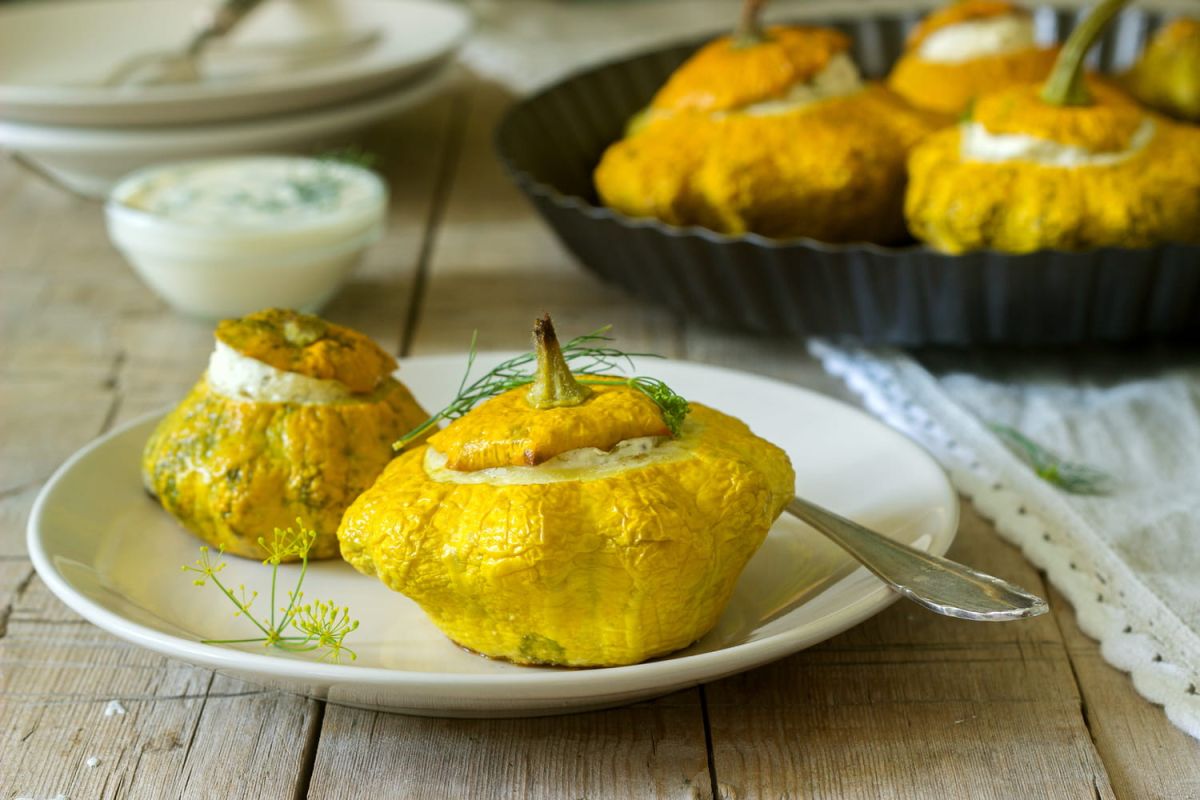 - Lavez les pâtissons, retirez leurs chapeaux, ôtez les graines et faites-les cuire 15 minutes dans de l’eau bouillante salée. Égouttez et mettez de côté.