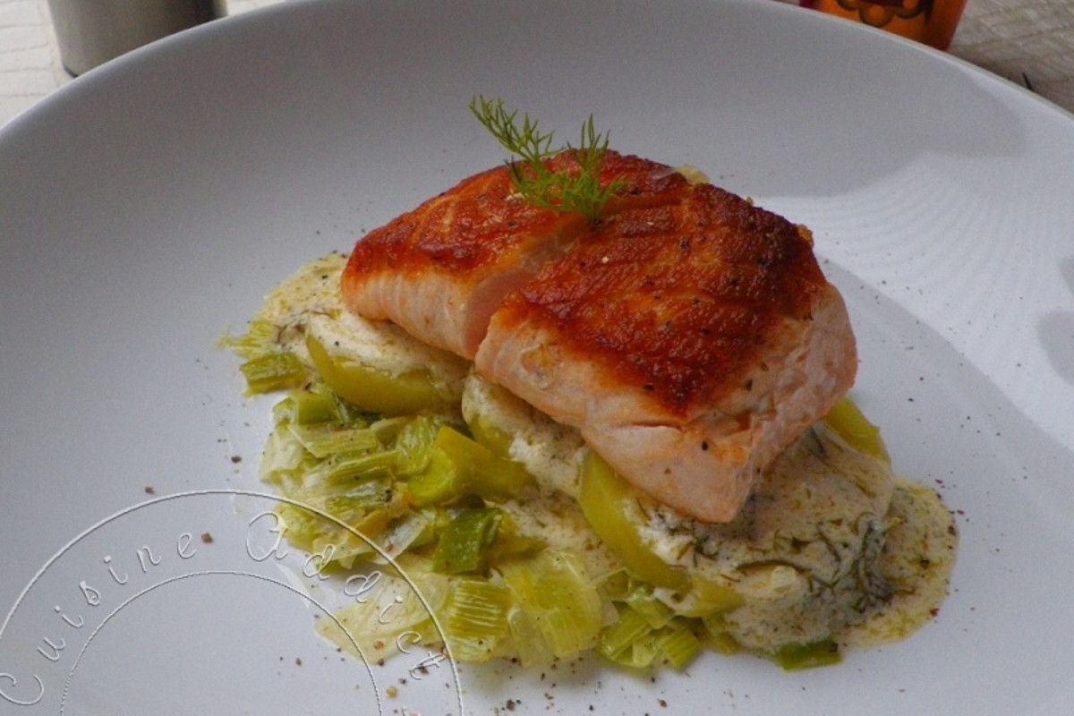 Un pavé de saumon croustillant sur un lit de fondue de poireaux savoureuse.