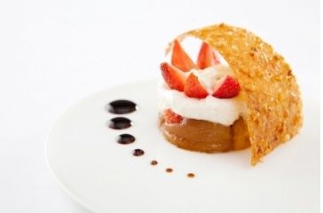 - Dans des assiettes creuses, répartissez les pommes confites, ajoutez les tuiles croquantes et les fraises fraîches. Dressez une quenelle de mousse mascarpone et nappez de réduction de vinaigre balsamique.
