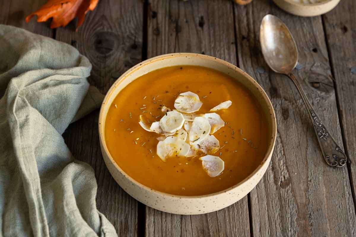 Je vous présente une première recette mettant en valeur ce légume racine un peu méconnu : un délicieux velouté de butternut et cerfeuil tubéreux. Cette association marie à merveille la douceur de la courge butternut avec les saveurs délicates du cerfeuil tubéreux, offrant un plat réconfortant aux notes de châtaigne et de noisette.