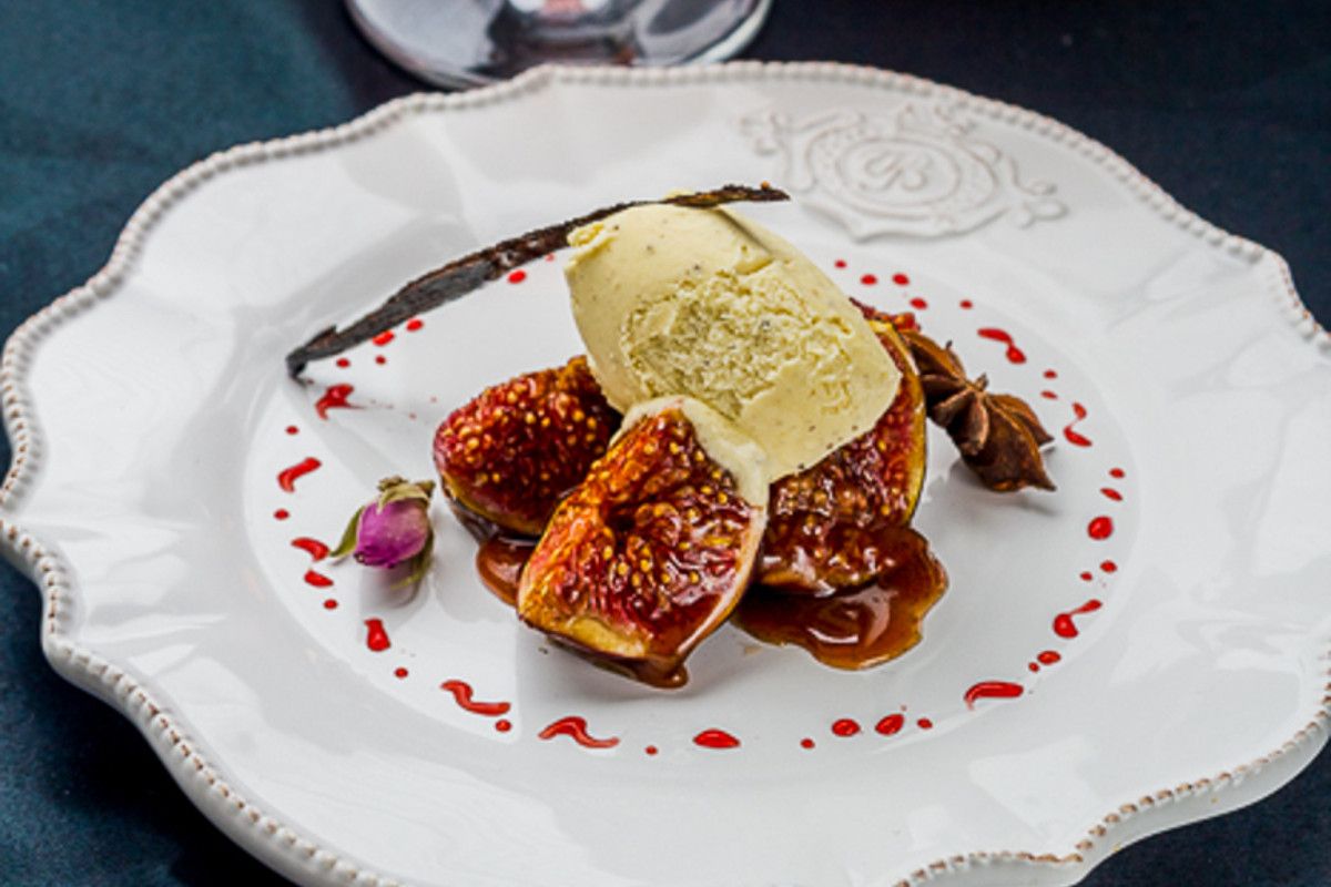 - Répartissez les figues dans les assiettes, nappez de la réduction de vin et garnissez d'une quenelle de glace à la fève de tonka.