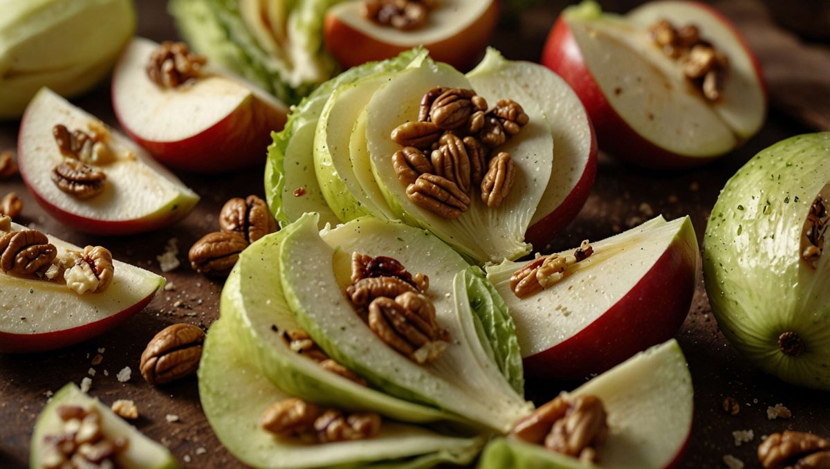 Assemblage : incorporez délicatement les lamelles de pomme et les noix concassées aux endives.