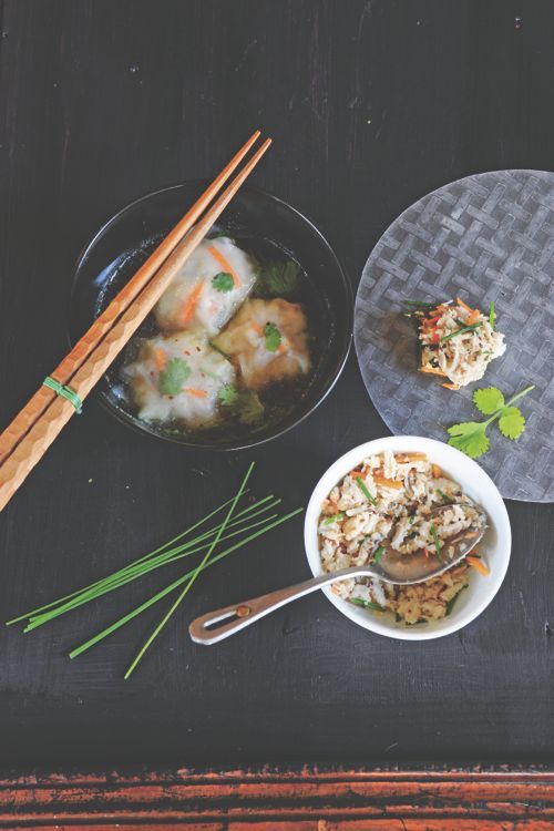 Découpez des disques de 10 cm de diamètre dans vos feuilles de riz. Étalez un torchon humide sur le plan de travail et disposez-y vos feuilles de riz. Humidifiez-les avec vos mains ; après quelques minutes, elles deviendront souples et prêtes à être manipulées.