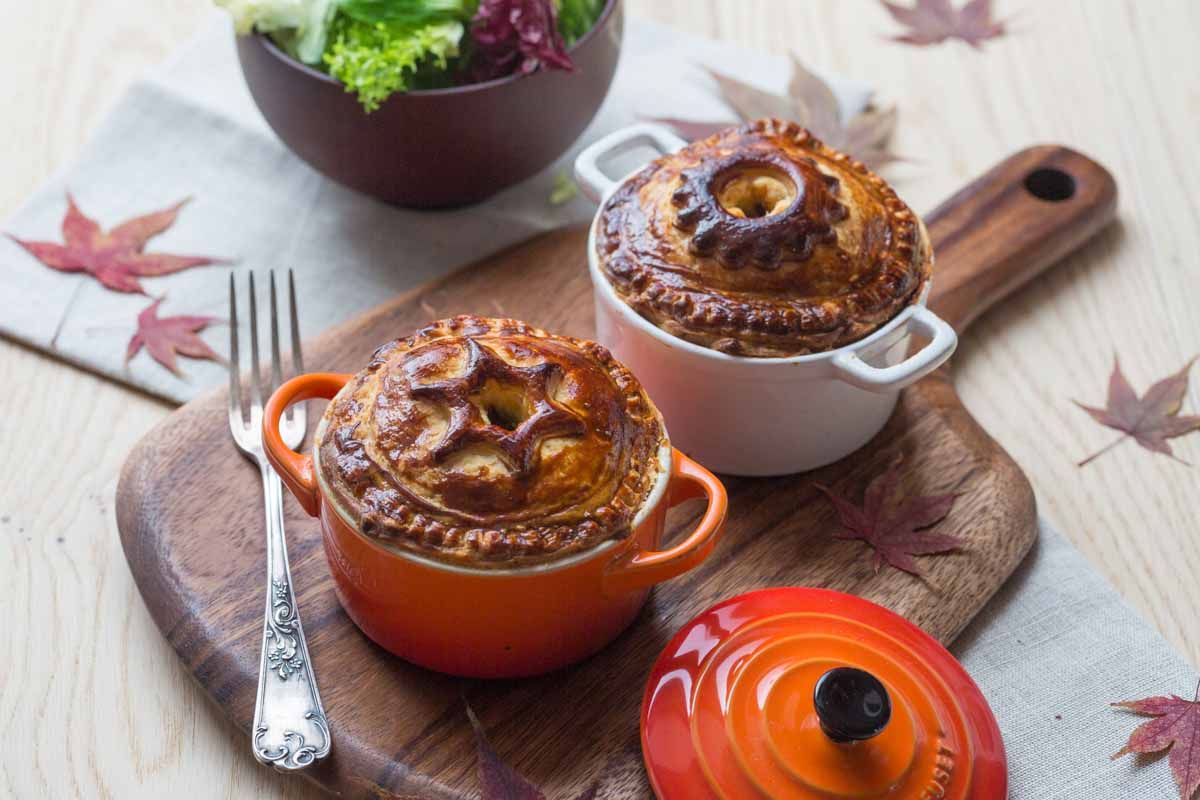 - Déroulez la pâte feuilletée restante, découpez-y 4 disques et recouvrez chaque pâté, en scellant les bords. Découpez une ouverture pour laisser échapper la vapeur.