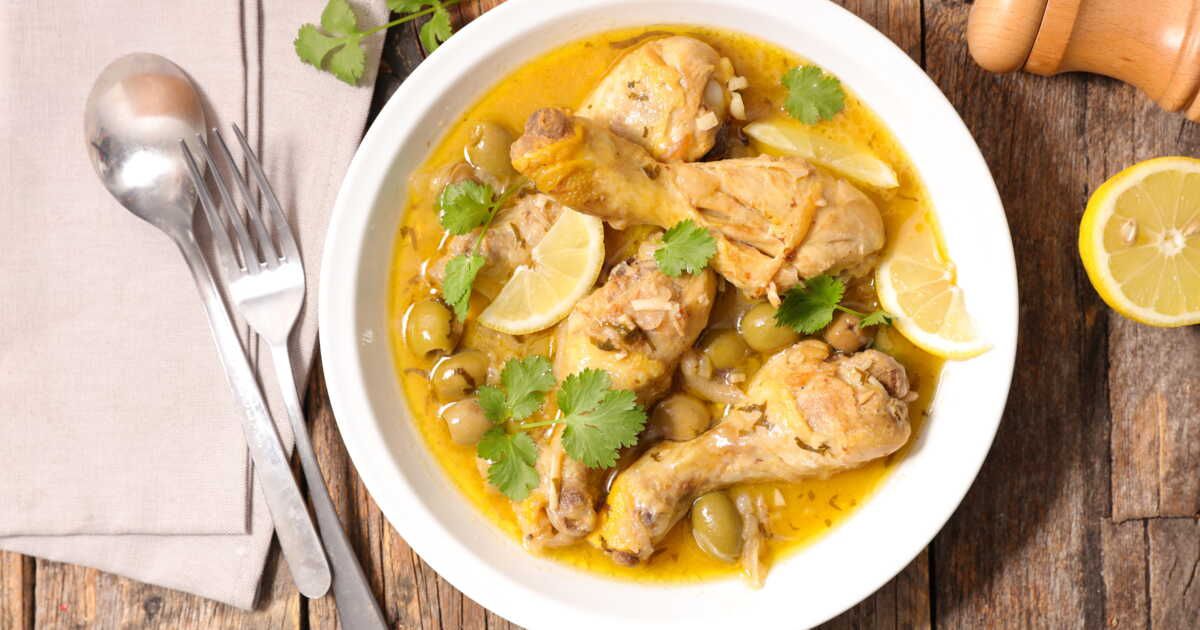 Après environ 5 minutes, ajoutez deux verres d’eau et le cube de bouillon. Pour un meilleur goût, n’hésitez pas à opter pour un bouillon fait maison. Découpez le citron confit en quartiers et incorporez-le avec les olives vertes dans la sauteuse. Couvrez et laissez mijoter pendant au moins 45 minutes. Pensez à remuer régulièrement pour éviter que ça n’accroche au fond de la casserole.