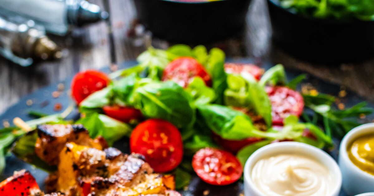 - Épluchez et coupez le concombre en lamelles. Mélangez-le avec les pousses d’épinards dans un saladier. Faites cuire les brochettes de poulet sur une plancha ou un barbecue jusqu'à ce qu'elles soient dorées.